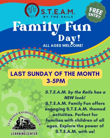 S.T.E.A.M by the Rails has a brand-new look! Each month offers a different activity that explores the areas of Science, Technology, Engineering, Art, and Math. Join us on the last Sunday of the month.