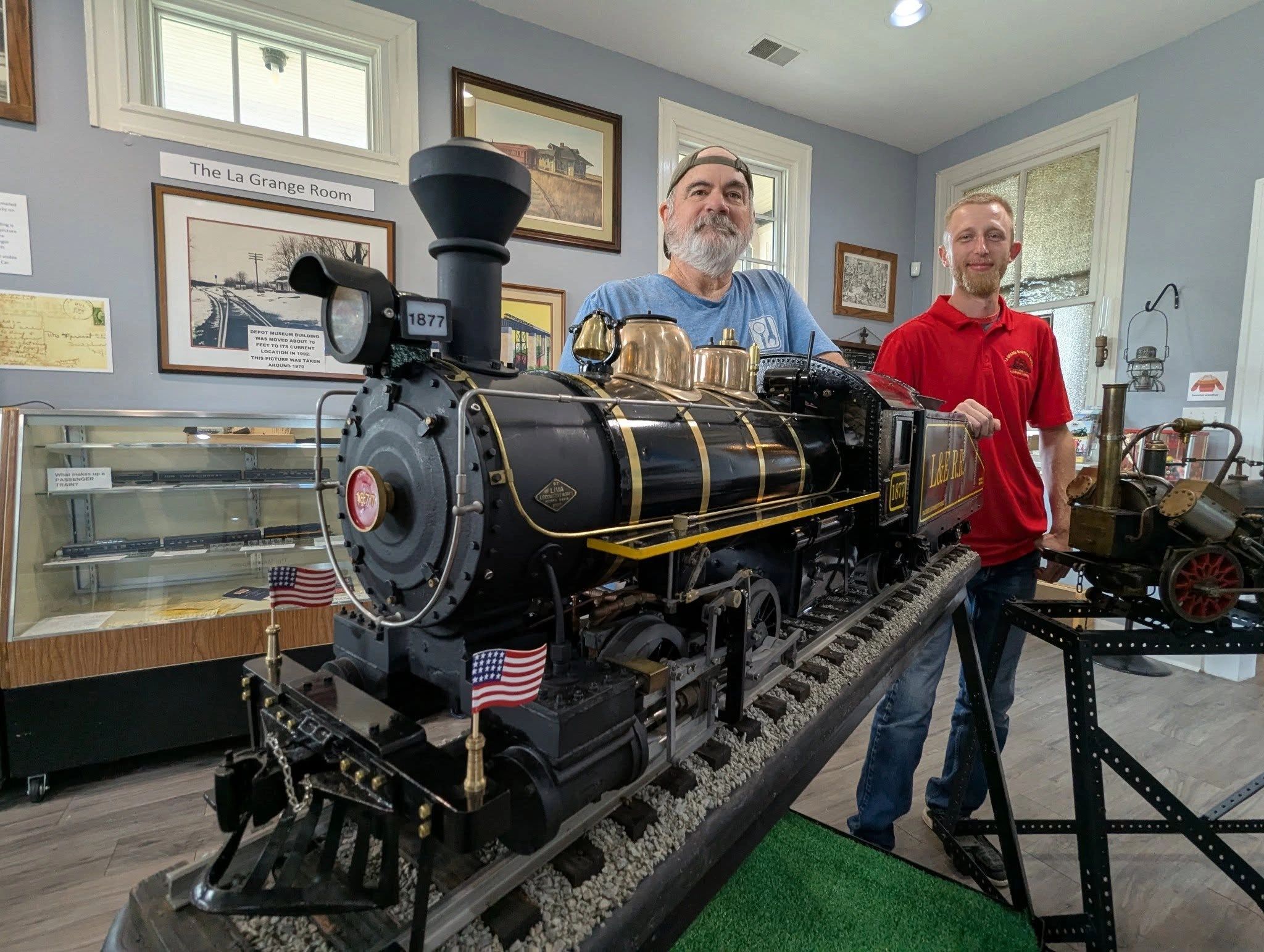 Volunteers Ken (left) and Mike (right) installed our new 0-4-0 Lima Steam engine replica refurbished by the Balmer Locomotive Works of Ohio. Check this piece out with its sister models the Hudson and Invicta.